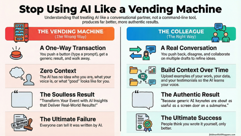 Stop getting corporate word salad. The fix is context, examples, and a back-and-forth that challenges the model until it sounds like you.